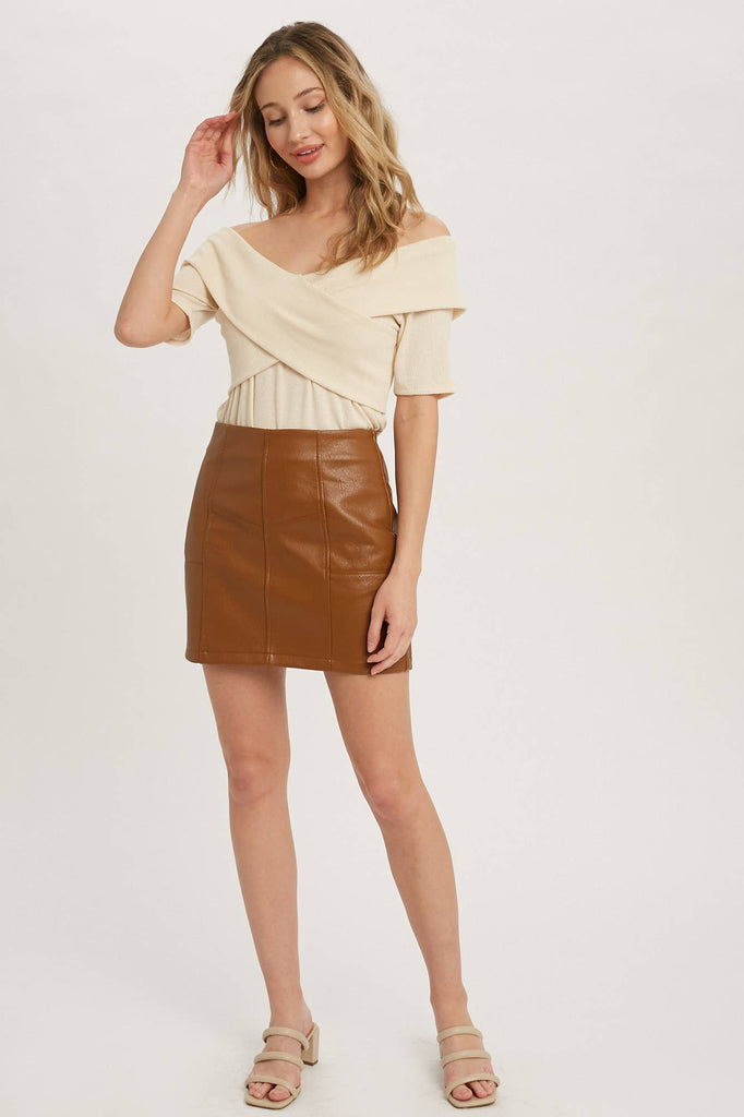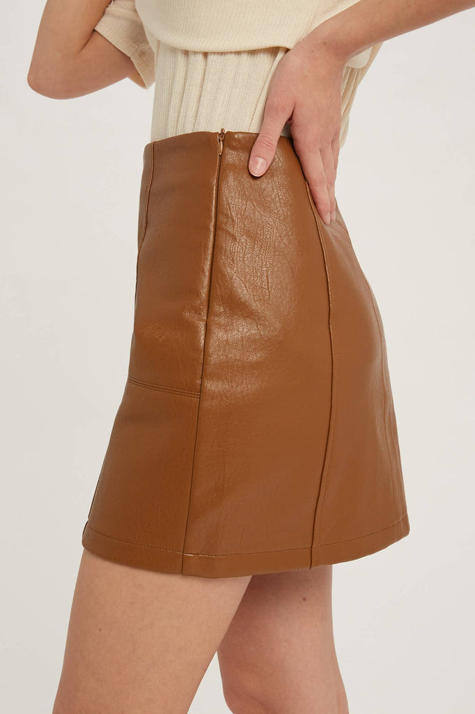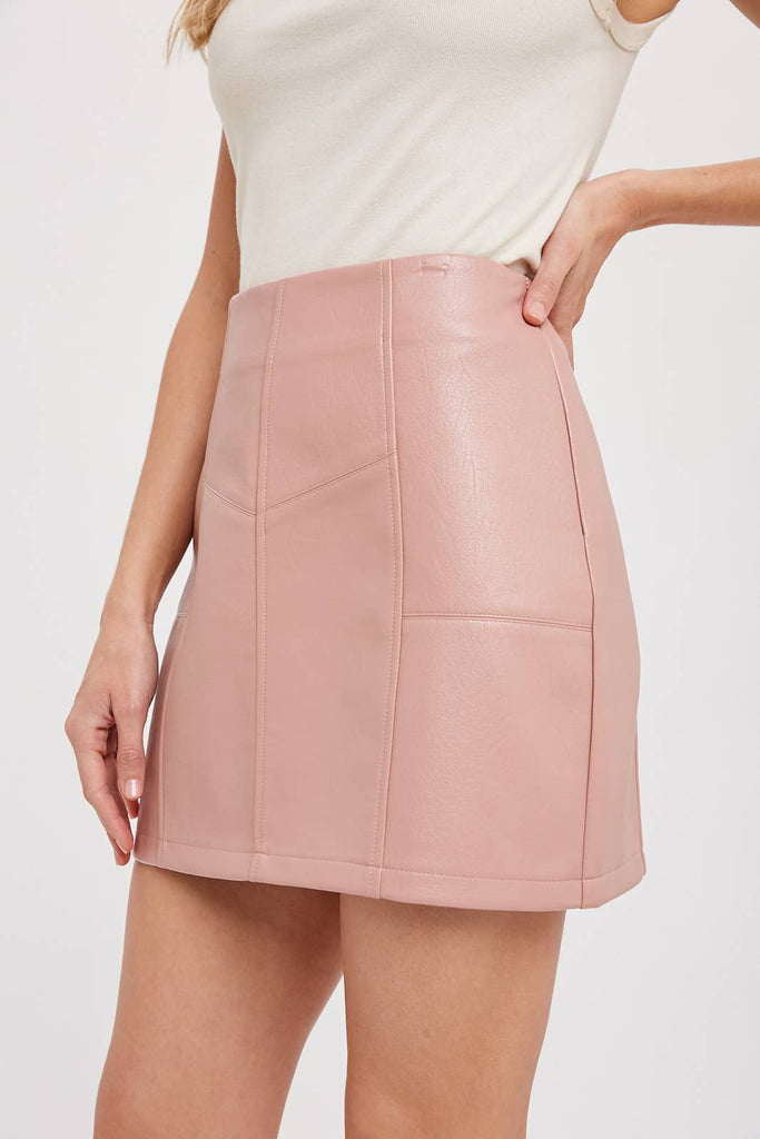 A faux leather mini skirt featuring a chic panelled design, seam construction, invisible side zipper and a A-line silhouette. -Model is 5'10" and wearing a Small -Size Ratio:2-2-2(S-M-L) -45%COTTON, 55%POLYURETHANE -FULL LENGTH 16.5" -Made in China