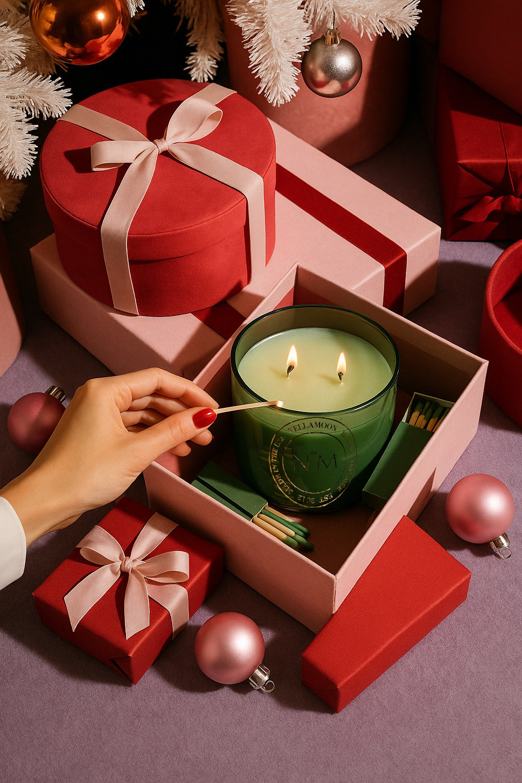 Hand-poured into our signature Evergreen Jar, a deep green vessel adorned with a gold embossed N•M emblem, this candle brings timeless elegance to the holiday season. Perfect for gifting or for creating your own serene winter sanctuary.