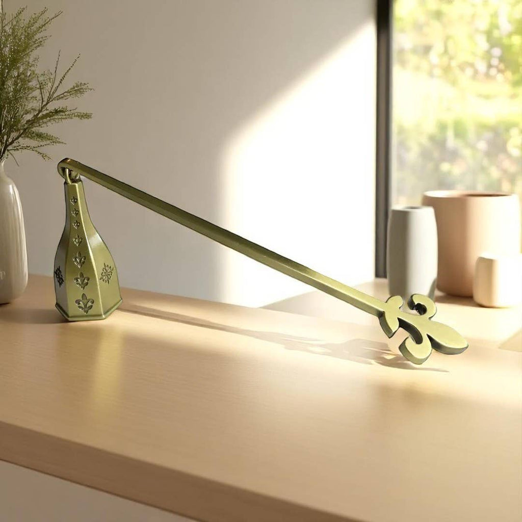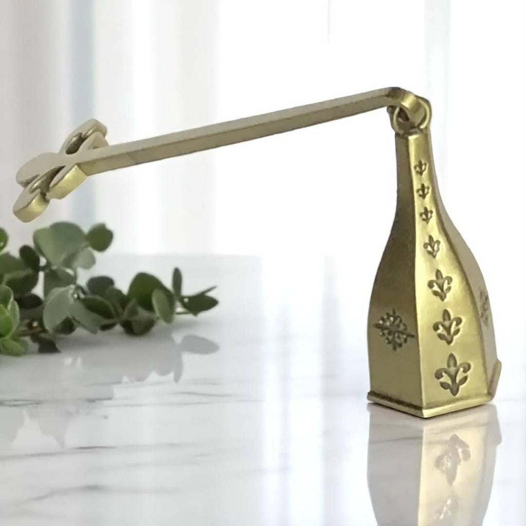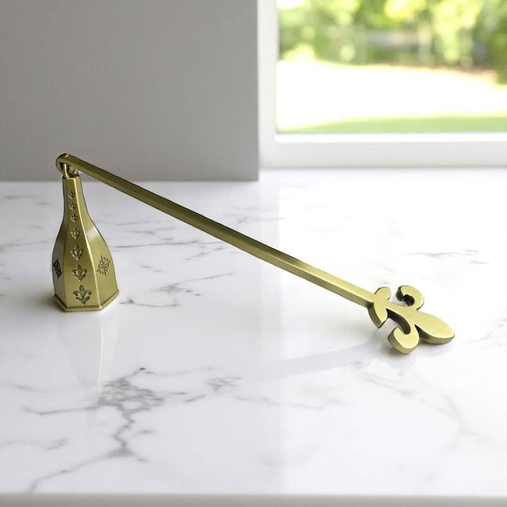 Antique Brass Fleur de Lis Bell Snuffer -Old World look taper candle snuffer. -7" long x bell 2.25" long, bell width 1" -Great for snuffing taper candles to prevent wax from flying off tip of candle -2.7 ounces.