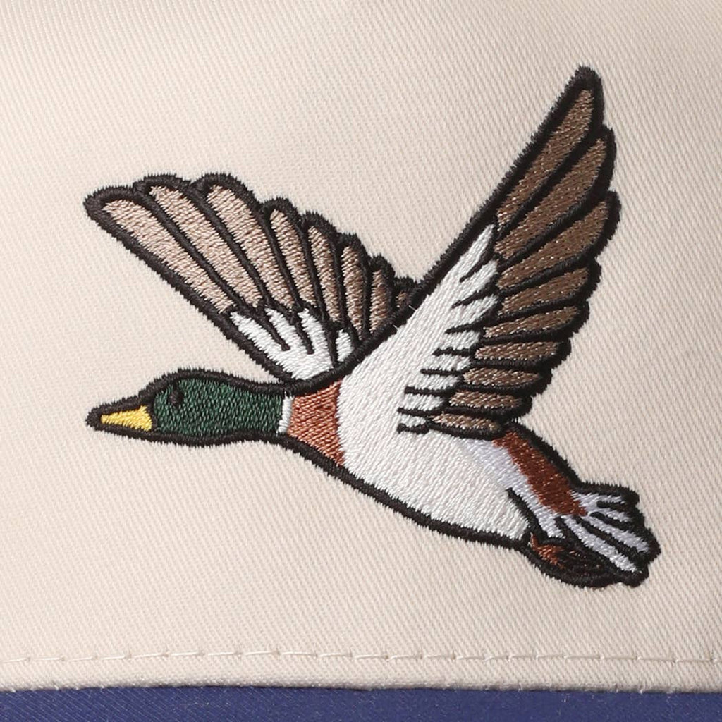 Flying Mallard Graphic Embroidered Trucker Hat - Flying Mallard Graphic Embroidery - 5 Panel Mid Profile Trucker Hat - Slight Curved - 65% Polyester / 35% Cotton - Customized on the OTTO Body Cap ** One size fits most: Adjustable snapback closure ** This two-tone cap features a beautifully embroidered flying mallard graphic on the front, capturing a vintage outdoor aesthetic with a modern twist. Made with a structured crown and curved brim, it offers a balanced fit and a clean silhouette. The contrasting bill colors—available in green, red, blue, and more—add a bold accent to the neutral-toned crown. Perfect for nature lovers, outdoor enthusiasts, or anyone looking to add a rustic Americana touch to their wardrobe. The adjustable snapback closure ensures a customizable fit, making this cap both stylish and practical for everyday wear or weekend adventures.