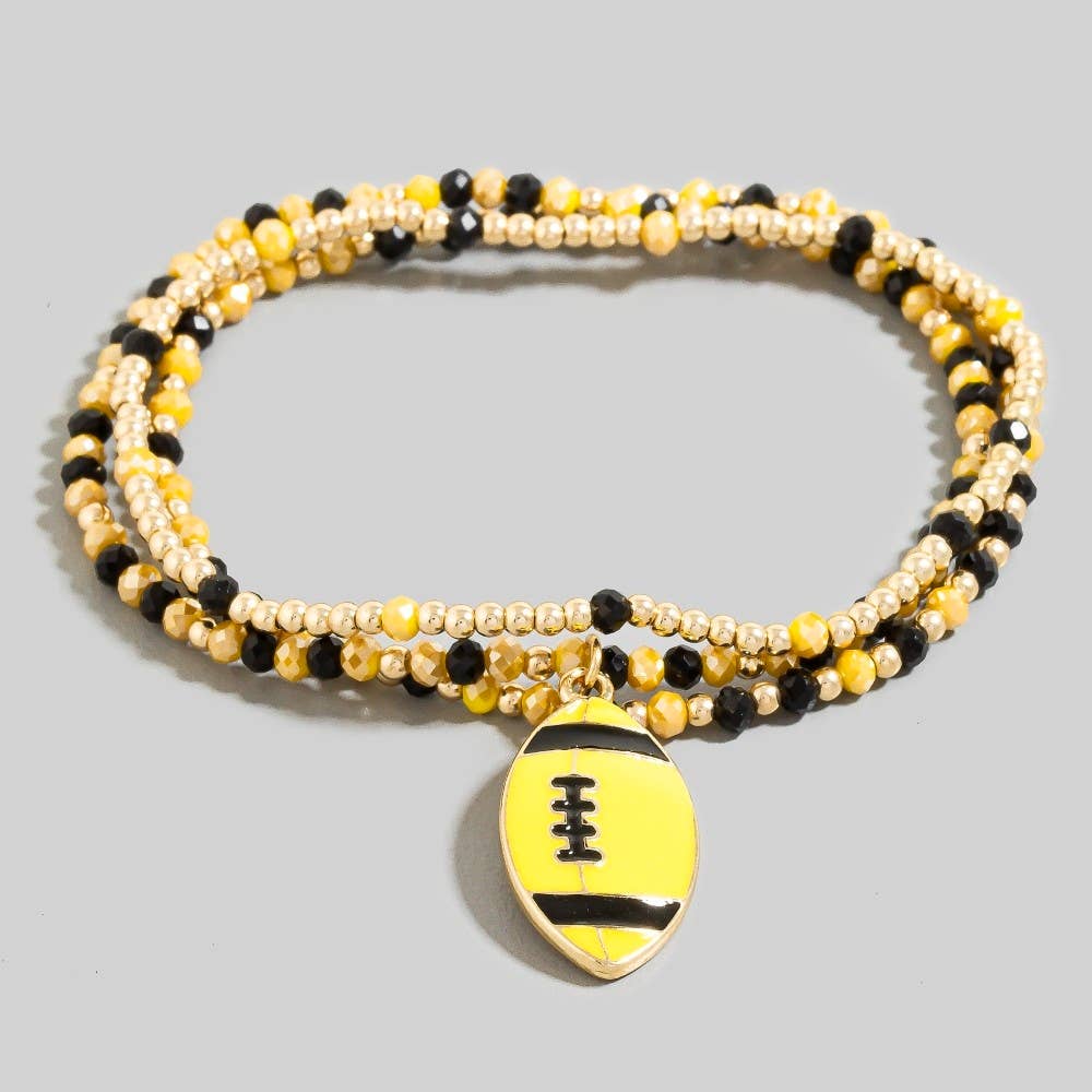 This bracelet introduces a unique game day colors enamel football beaded style. Delight in the nuanced details that make this bracelet a testament to fine design and impeccable taste. MADE IN CHINA 45%GLASS 45% PLASTIC 10% IRON