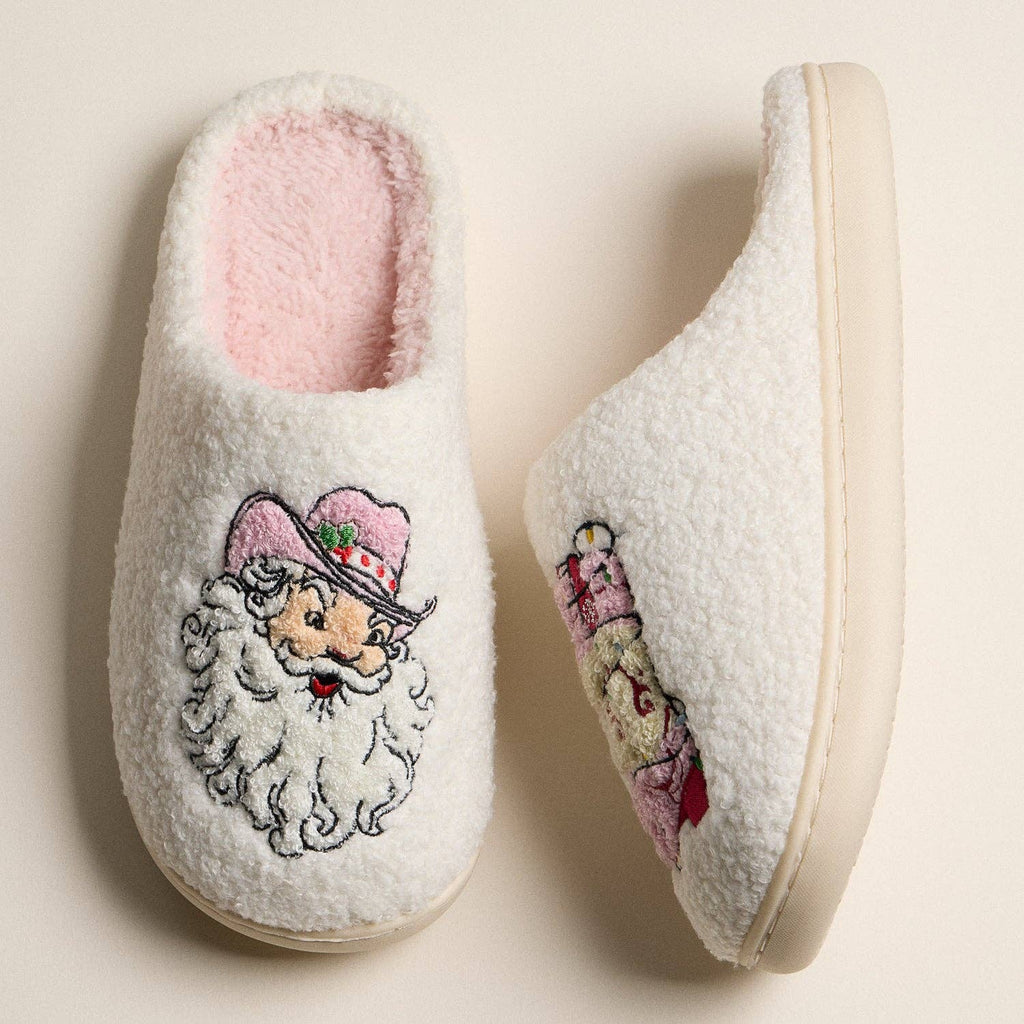 Get into the holiday spirit with these fuzzy slippers featuring playful Western-themed embroidery. One slipper showcases a jolly cowboy Santa in a pink hat, while the other displays a festive pink cowboy boot wrapped in holiday lights. Made with ultra-soft polyester fleece and a cozy pink lining, these slip-ons are finished with a durable non-slip sole—perfect for gifting or relaxing in festive comfort. Product Features: ● Material: Soft polyester fleece with plush interior ● Embroidery: Cowboy Santa face and holiday boot design ● Sole: Non-slip rubber bottom for indoor wear ● Fit: Slip-on style for easy comfort ● Style: Holiday, Western, novelty ● Great for: Gifting, lounging, holiday mornings Why You'll Love It: ● Unique Western holiday theme ● Cozy and warm for winter days ● Perfect for Christmas gifting or festive lounging